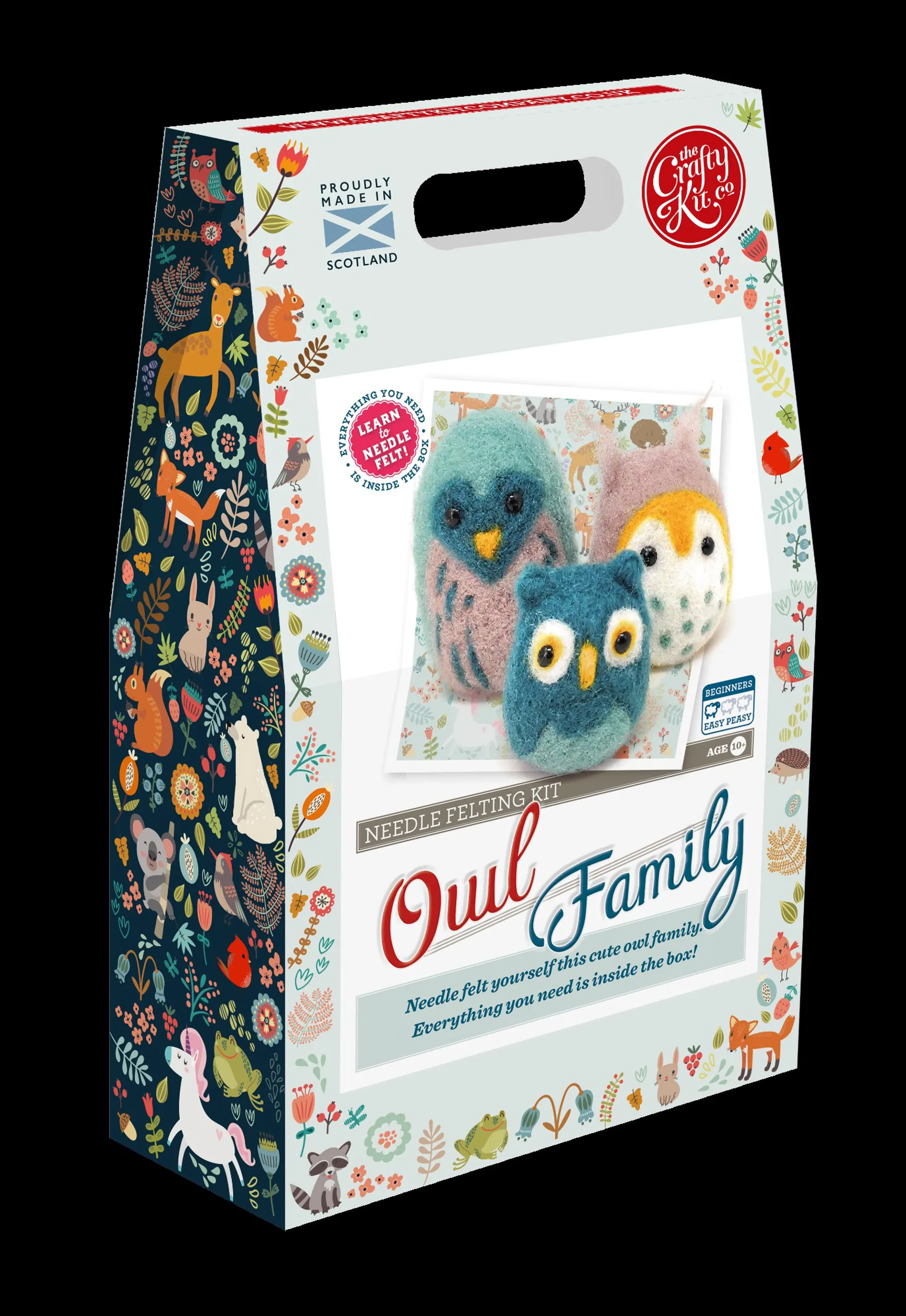 A complete needle felting kit by The Crafty Kit Company, with everything you need to create a charming owl family – suitable for beginners and experienced crafters alike.