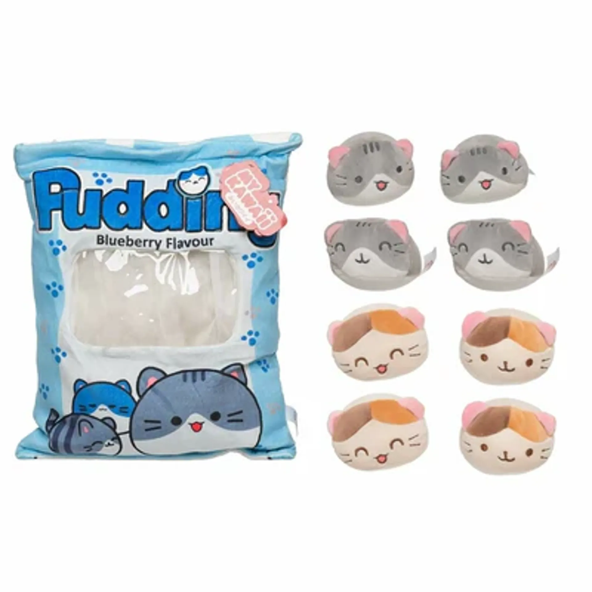 This adorable plush pillow features a cute design with 8 blueberry scented plush cats.