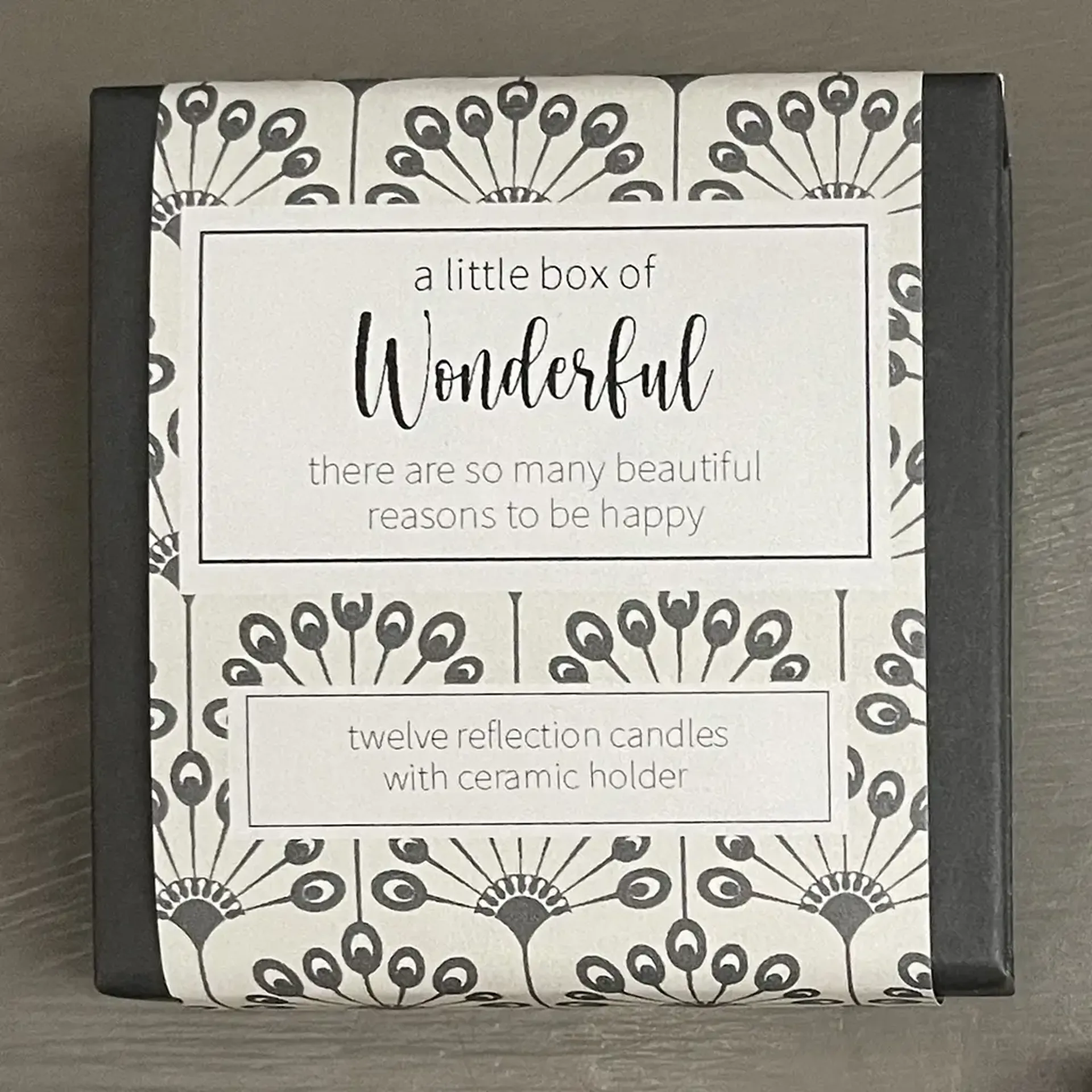 Each set contains twelve 20 minute candles and a ceramic holder.