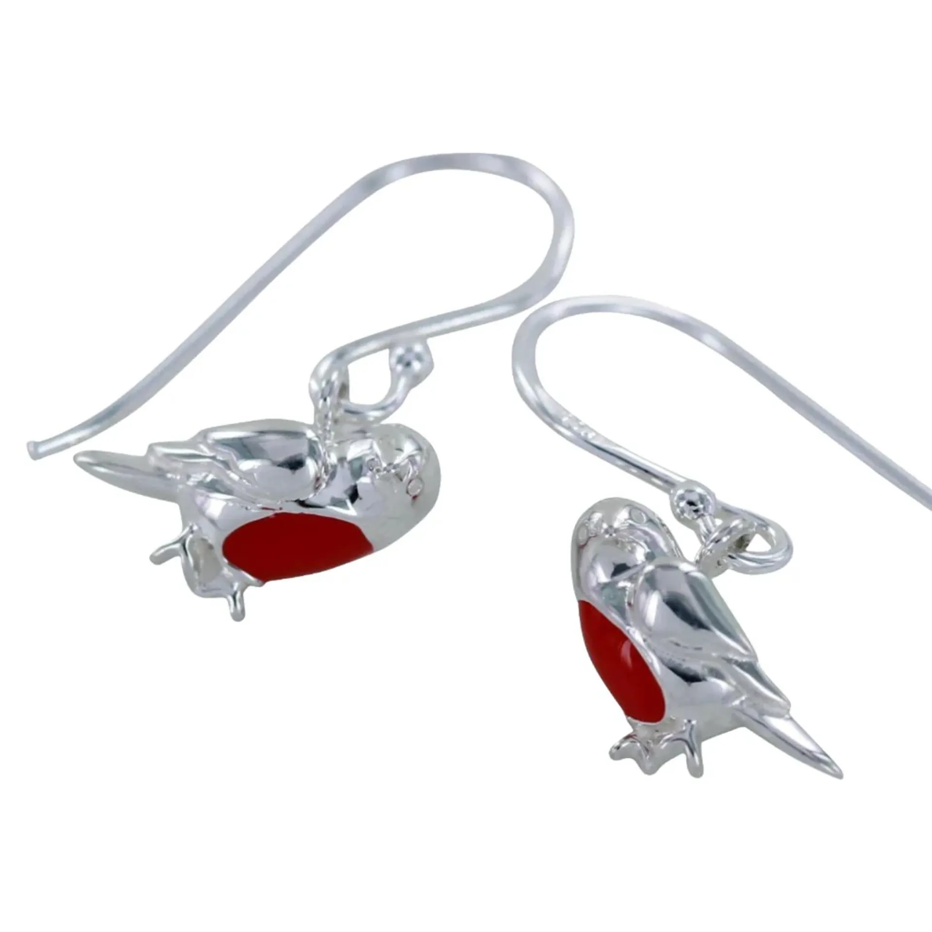Sterling silver robin drop earrings with enamel detailing, adding a charming touch to any outfit.