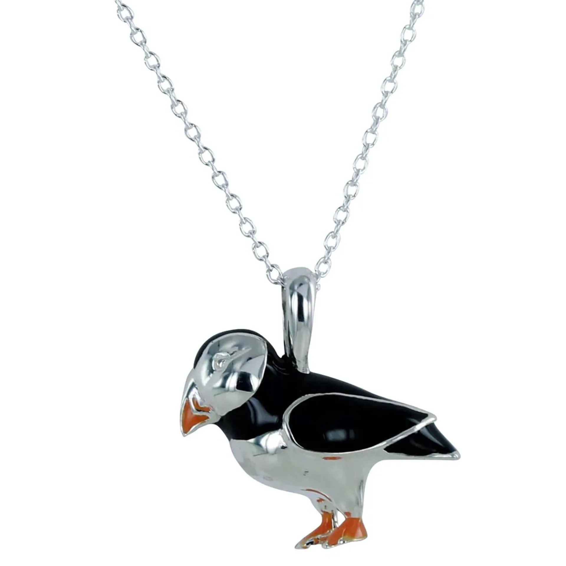 A cute sterling silver puffin pendant necklace by Reeves & Reeves - charming, detailed, and designed with love for wildlife.