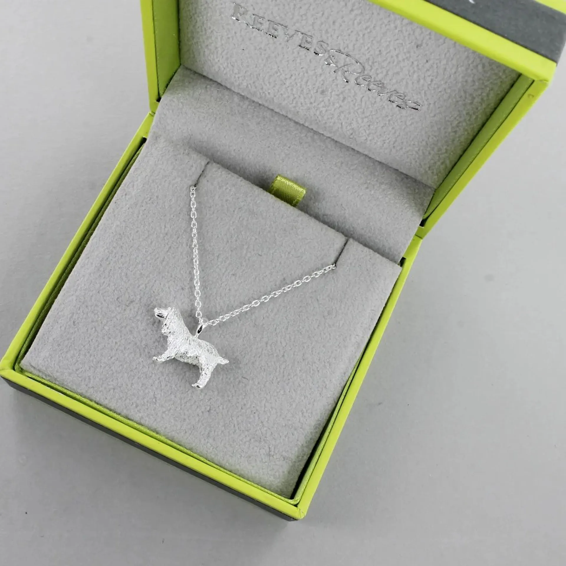 The Reeves & Reeves Silver Spaniel Necklace beautifully captures the breed’s elegant silhouette with a flowing, detailed coat. Crafted from recycled sterling silver, the pendant measures approximately 20 mm × 13 mm and hangs from a chain adjustable between 16″ and 19″. Designed in Dorset, this piece embodies Reeves & Reeves’ commitment to sustainability and craftsmanship. A thoughtful, charming gift for anyone who loves dogs, especially Spaniels, or appreciates detailed animal jewellery.