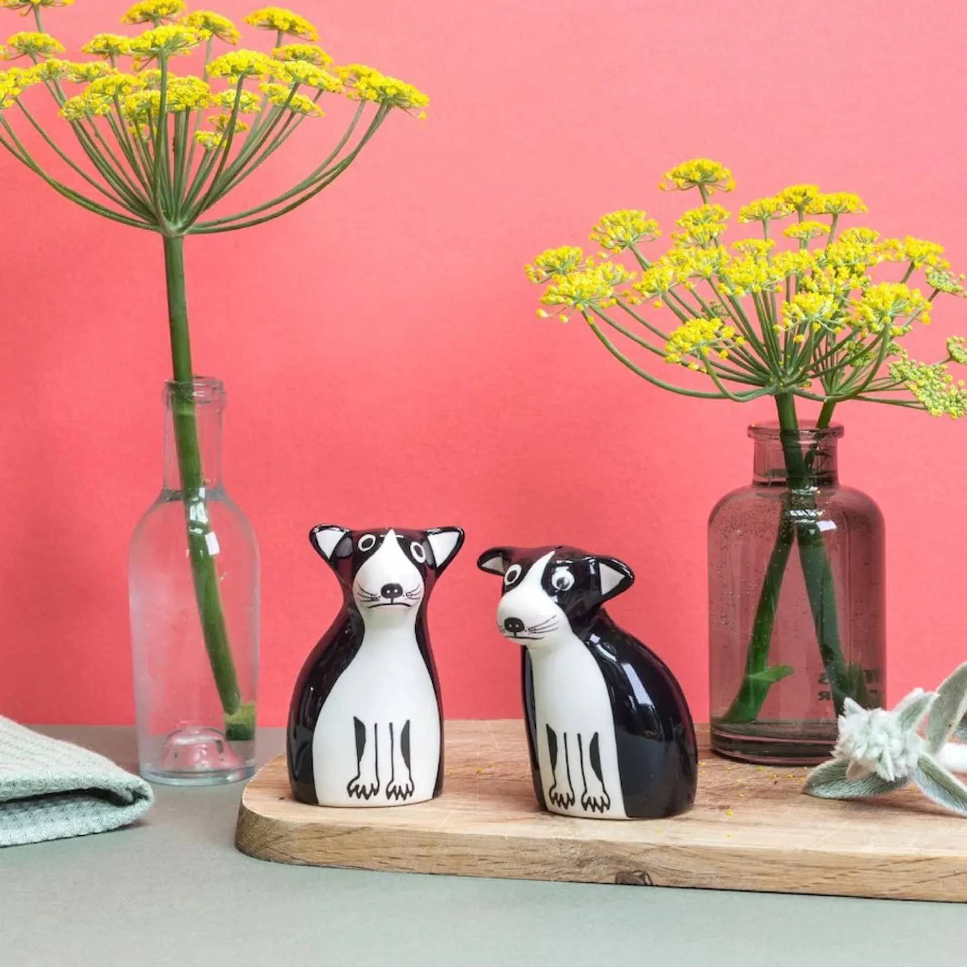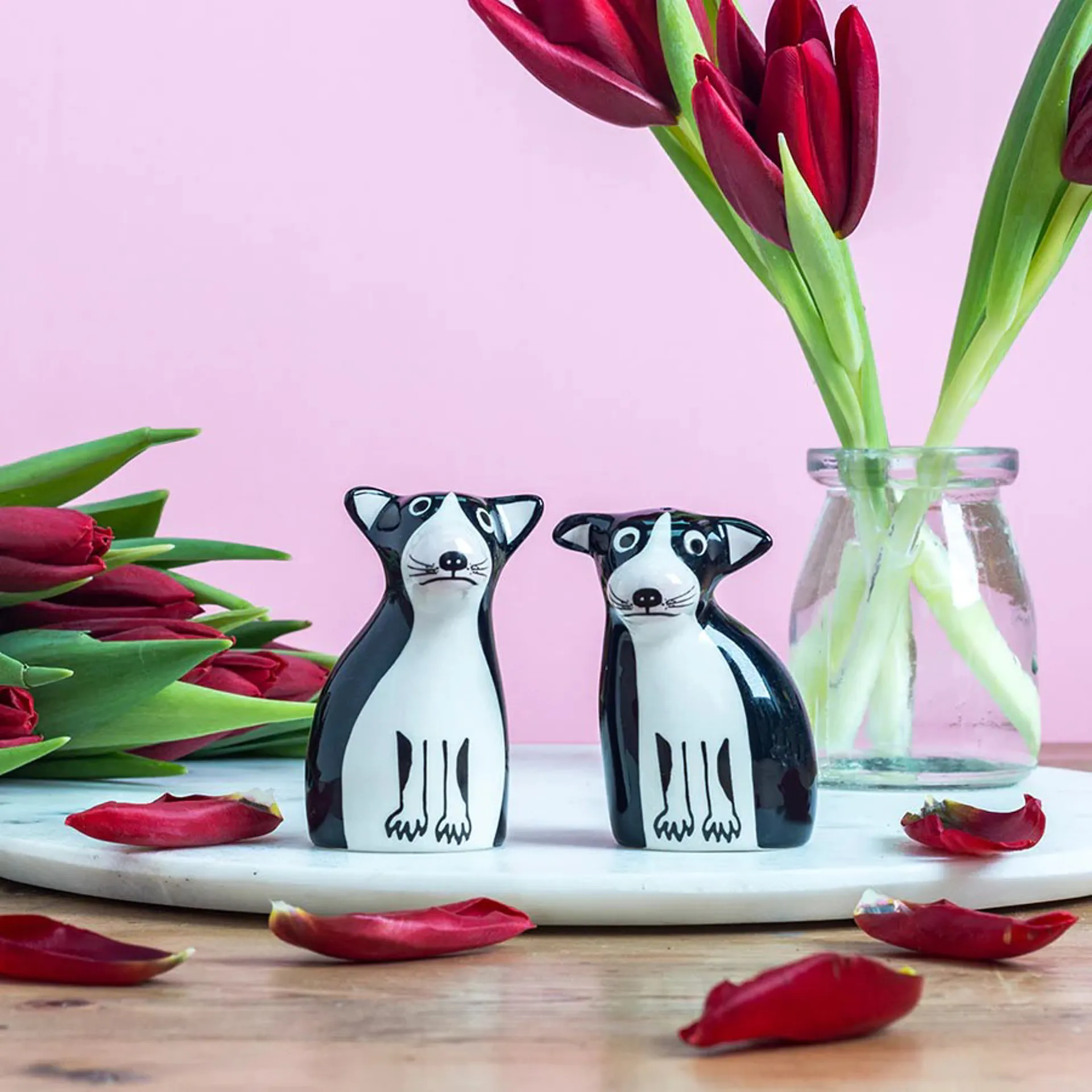 Create canine capers on your tabletop or add a bit of woof to your kitchen with these Boston Terrier Salt and Pepper Shakers by Hannah Turner.. Modelled partly on Hannah's Mums Dog Poppy, with their happy faces, this fun pair bring character and joy every time you use them. They make perfect gifts for dog lovers or just to brighten-up your own kitchen table! The salt & pepper set comes beautifully packaged in a recycled card gift box with an illustrated label on top, ready to wrap and send.